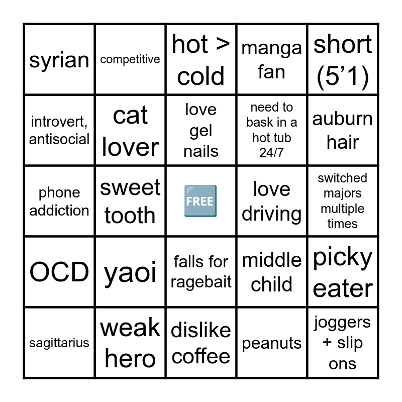 This bingo card has a free space and 24 words: yaoi, weak hero, love gel nails, sagittarius, short (5’1), syrian, introvert, antisocial, competitive, love driving, falls for ragebait, need to bask in a hot tub 24/7, phone addiction, middle child, picky eater, cat lover, peanuts, switched majors multiple times, hot > cold, auburn hair, sweet tooth, joggers + slip ons, OCD, manga fan and dislike coffee.
