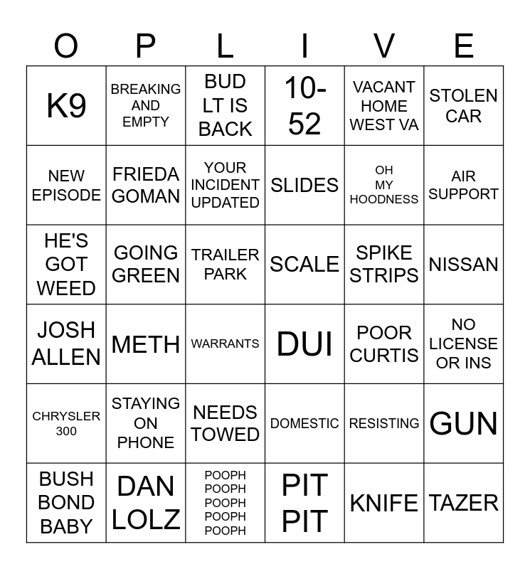 This bingo card has 36 words: JOSH ALLEN, METH, POOPH POOPH POOPH POOPH POOPH, SLIDES, SPIKE STRIPS, NISSAN, K9, DAN LOLZ, BUD LT IS BACK, DOMESTIC, OH MY HOODNESS, STOLEN CAR, CHRYSLER 300, GOING GREEN, YOUR INCIDENT UPDATED, 10-52, RESISTING, NO LICENSE OR INS, NEW EPISODE, FRIEDA GOMAN, WARRANTS, DUI, POOR CURTIS, GUN, HE'S GOT WEED, BREAKING AND EMPTY, TRAILER PARK, PIT PIT, VACANT HOME WEST VA, AIR SUPPORT, BUSH BOND BABY, STAYING ON PHONE, NEEDS TOWED, SCALE, KNIFE and TAZER.
