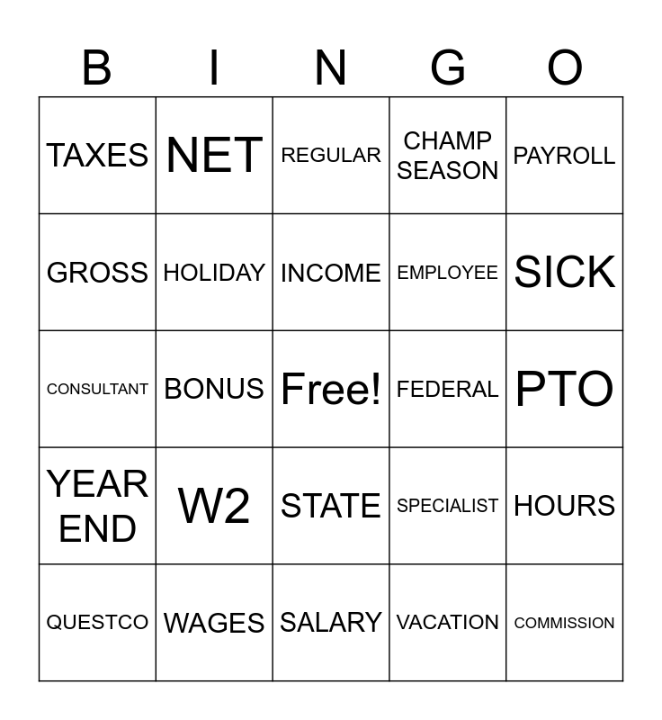 This bingo card has a free space and 24 words: W2, WAGES, INCOME, QUESTCO, PAYROLL, TAXES, GROSS, NET, FEDERAL, STATE, EMPLOYEE, CONSULTANT, SPECIALIST, HOURS, HOLIDAY, VACATION, PTO, REGULAR, SICK, BONUS, COMMISSION, YEAR END, CHAMP SEASON and SALARY.