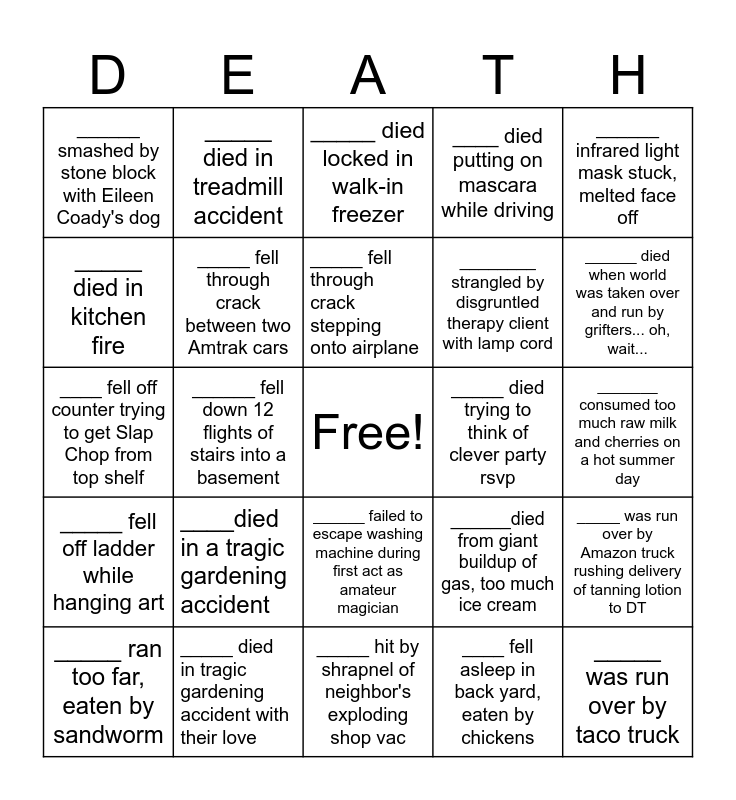 This bingo card has a free space and 24 words: ____died in a tragic gardening accident, _____ died in tragic gardening accident with their love, _____ fell through crack stepping onto airplane, _____ ran too far, eaten by sandworm, ______ infrared light mask stuck, melted face off, ______ smashed by stone block with Eileen Coady's dog, _____ died in kitchen fire, _____ died in treadmill accident, _____ died trying to think of clever party rsvp, ______ failed to escape washing machine during first act as amateur magician, ________ strangled by disgruntled therapy client with lamp cord, ____ fell off counter trying to get Slap Chop from top shelf, ______died from giant buildup of gas, too much ice cream, _____ was run over by Amazon truck rushing delivery of tanning lotion to DT, _____ fell through crack between two Amtrak cars, ____ fell asleep in back yard, eaten by chickens, _______ consumed too much raw milk and cherries on a hot summer day, _____ died locked in walk-in freezer, ______ died when world was taken over and run by grifters... oh, wait..., ______ fell down 12 flights of stairs into a basement, _____ was run over by taco truck, _____ fell off ladder while hanging art, ____ died putting on mascara while driving and _____ hit by shrapnel of neighbor's exploding shop vac.