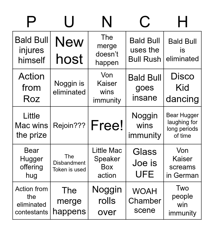 This bingo card has a free space and 24 words: The Disbandment Token is used, The merge happens, Von Kaiser wins immunity, Action from the eliminated contestants, Bald Bull is eliminated, Bald Bull injures himself, Action from Roz, New host, Noggin wins immunity, Little Mac Speaker Box action, Bald Bull goes insane, Little Mac wins the prize, Glass Joe is UFE, Von Kaiser screams in German, Noggin is eliminated, WOAH Chamber scene, Bear Hugger laughing for long periods of time, The merge doesn’t happen, Disco Kid dancing, Rejoin???, Two people win immunity, Bear Hugger offering hug, Bald Bull uses the Bull Rush and Noggin rolls over.