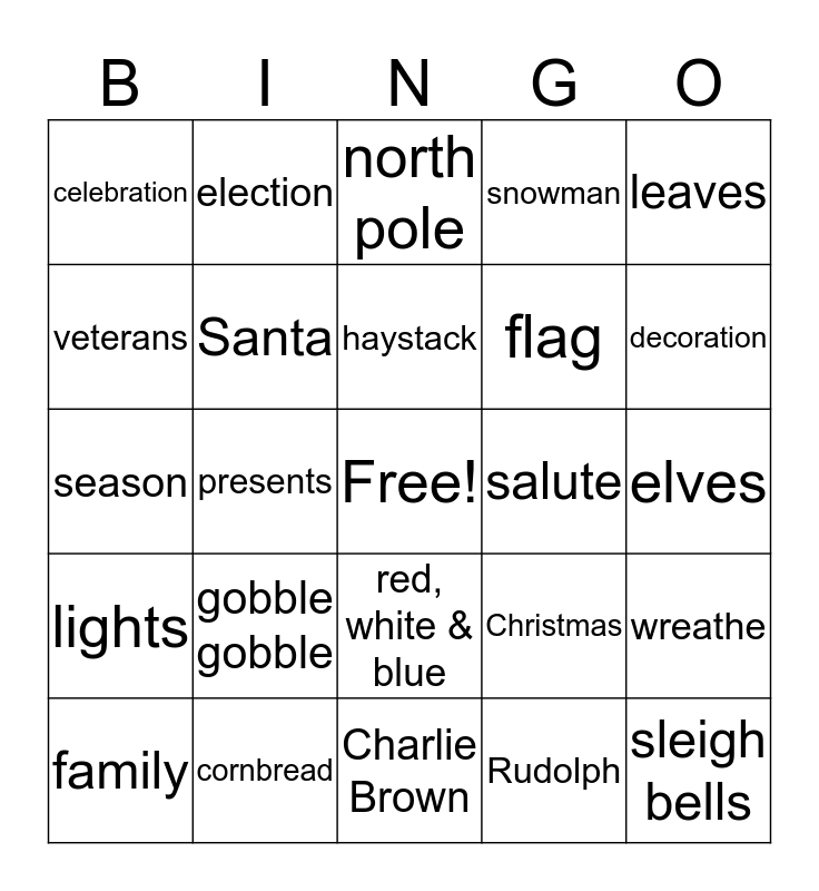 This bingo card has a free space and 24 words: gobble gobble, cornbread, haystack, family, leaves, celebration, veterans, election, salute, red, white & blue, flag, season, Christmas, wreathe, Santa, Rudolph, elves, north pole, decoration, presents, sleigh bells, lights, snowman and Charlie Brown.