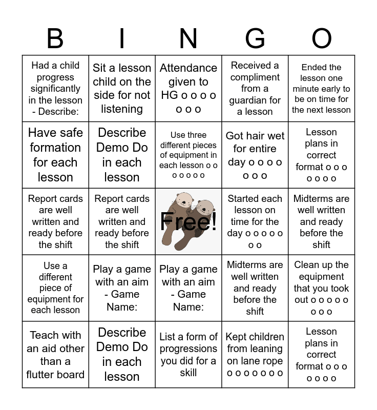 This bingo card has a free space and 48 words: Sing a song - Song Name:, Lesson plans in correct format o o o o o o o, Teach with an aid other than a flutter board, List a form of progressions you did for a skill, Play a game with an aim - Game Name:, Use a different piece of equipment for each lesson, Sit a lesson child on the side for not listening, Have worksheets done correctly for the entire session, Have safe formation for each lesson, Core plans on site, Describe Demo Do in each lesson, Received a compliment from a guardian for a lesson, Clean up the equipment that you took out o o o o o o o o, Midterms are well written and ready before the shift, Set up the equipment for lesson beforehand, Sent a parent to the HG to answer a question, Use three different pieces of equipment in each lesson o o o o o o o, Started each lesson on time for the day o o o o o o o, Attendance given to HG o o o o o o o, Ended the lesson one minute early to be on time for the next lesson, Report cards are well written and ready before the shift, Kept children from leaning on lane rope o o o o o o o, Had a child progress significantly in the lesson - Describe:, Got hair wet for entire day o o o o o o o, Sing a song - Song Name:, Lesson plans in correct format o o o o o o o, Teach with an aid other than a flutter board, List a form of progressions you did for a skill, Play a game with an aim - Game Name:, Use a different piece of equipment for each lesson, Sit a lesson child on the side for not listening, Have worksheets done correctly for the entire session, Have safe formation for each lesson, Core plans on site, Describe Demo Do in each lesson, Received a compliment from a guardian for a lesson, Clean up the equipment that you took out o o o o o o o o, Midterms are well written and ready before the shift, Set up the equipment for lesson beforehand, Sent a parent to the HG to answer a question, Use three different pieces of equipment in each lesson o o o o o o o, Started each lesson on time for the day o o o o o o o, Attendance given to HG o o o o o o o, Ended the lesson one minute early to be on time for the next lesson, Report cards are well written and ready before the shift, Kept children from leaning on lane rope o o o o o o o, Had a child progress significantly in the lesson - Describe: and Got hair wet for entire day o o o o o o o.