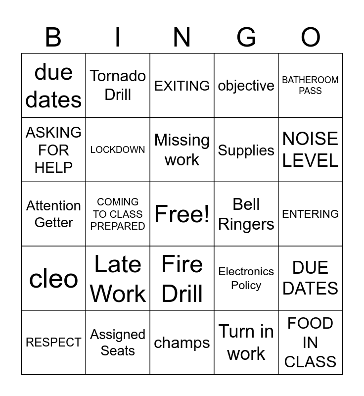 This bingo card has a free space and 24 words: Late Work, Assigned Seats, Missing work, RESPECT, BATHEROOM PASS, due dates, ASKING FOR HELP, Tornado Drill, Bell Ringers, Fire Drill, Supplies, Attention Getter, Electronics Policy, DUE DATES, LOCKDOWN, Turn in work, ENTERING, EXITING, NOISE LEVEL, COMING TO CLASS PREPARED, FOOD IN CLASS, cleo, objective and champs.