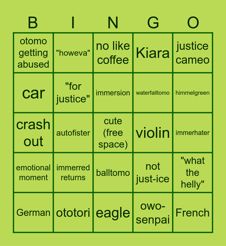 This bingo card has a free space and 24 words: immerred returns, ototori, immersion, German, justice cameo, otomo getting abused, car, "howeva", violin, balltomo, waterfalltomo, crash out, not just-ice, "what the helly", "for justice", owo-senpai, immerhater, no like coffee, himmelgreen, autofister, French, emotional moment, Kiara and eagle.