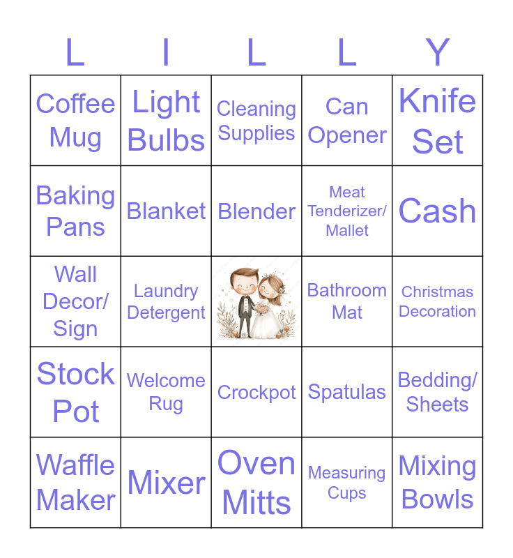 This bingo card has a free space and 24 words: Waffle Maker, Welcome Rug, Blender, Measuring Cups, Knife Set, Coffee Mug, Light Bulbs, Cleaning Supplies, Bathroom Mat, Christmas Decoration, Wall Decor/ Sign, Blanket, Spatulas, Bedding/ Sheets, Baking Pans, Mixer, Oven Mitts, Can Opener, Cash, Stock Pot, Laundry Detergent, Crockpot, Meat Tenderizer/ Mallet and Mixing Bowls.