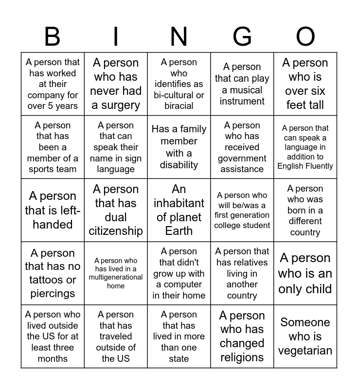 This bingo card has a free space and 24 words: A person who lived outside the US for at least three months, A person who has lived in a multigenerational home, Has a family member with a disability, A person who has changed religions, A person who is over six feet tall, A person that has worked at their company for over 5 years, A person who has never had a surgery, A person who identifies as bi-cultural or biracial, A person who will be/was a first generation college student, A person who was born in a different country, A person that is left-handed, A person that can speak their name in sign language, A person that has relatives living in another country, A person who is an only child, A person that has been a member of a sports team, A person that has traveled outside of the US, A person that has lived in more than one state, A person that can play a musical instrument, A person that can speak a language in addition to English Fluently, A person that has no tattoos or piercings, A person that has dual citizenship, A person that didn't grow up with a computer in their home, A person who has received government assistance and Someone who is vegetarian.