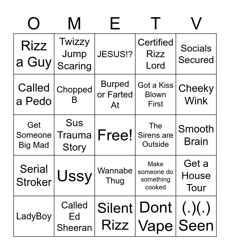 This bingo card has a free space and 39 words: Drugged Up Cooker, Called EW!, Called Old, Chopped B, LadyBoy, Wannabe Thug, Burped or Farted At, Screamed At, Socials Secured, Serial Stroker, Sus Trauma Story, Certified Rizz Lord, (.)(.) Seen, Smooth Brain, The Sirens are Outside, Ussy, Filipino Rizzed, Rizz a Guy, Get Called Daddy, Make someone do something cooked, Called a Pedo, Silent Rizz, Got a Kiss Blown First, Cheeky Wink, Boonda, Overshared their Life Story, Is that a Guy or Girl?, Existence Ignored, Streamer Found, Twizzy Jump Scaring, They Said Sumn Racist, Recognized by Someone, JESUS!?, Called Ed Sheeran, Dont Vape, I've Lost My Vape, Get a House Tour, Get Someone Big Mad and Guy shows how to eat kitty.