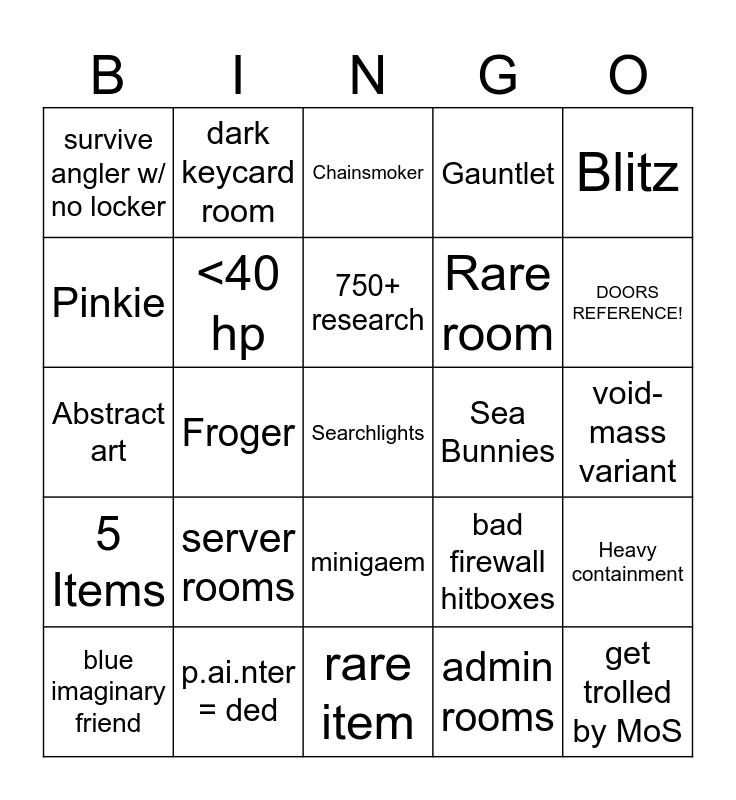 This bingo card has a free space and 24 words: server rooms, p.ai.nter = ded, 750+ research, blue imaginary friend, Blitz, survive angler w/ no locker, Pinkie, dark keycard room, Sea Bunnies, minigaem, Rare room, Abstract art, bad firewall hitboxes, Heavy containment, <40 hp, admin rooms, void-mass variant, Chainsmoker, DOORS REFERENCE!, Froger, get trolled by MoS, 5 Items, Gauntlet and rare item.