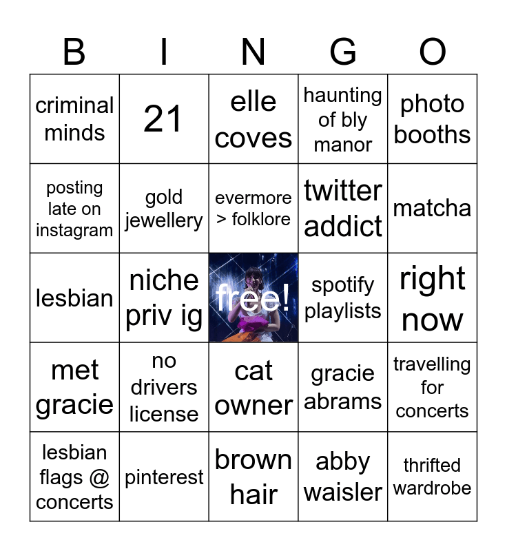 This bingo card has a free space and 24 words: no drivers license, pinterest, evermore > folklore, lesbian flags @ concerts, photo booths, criminal minds, posting late on instagram, 21, spotify playlists, cat owner, twitter addict, lesbian, gracie abrams, travelling for concerts, gold jewellery, abby waisler, right now, elle coves, matcha, niche priv ig, thrifted wardrobe, met gracie, haunting of bly manor and brown hair.