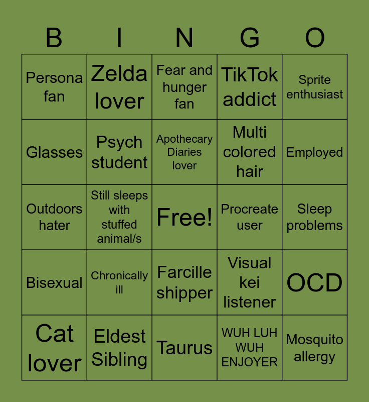 This bingo card has a free space and 24 words: Chronically ill, Eldest Sibling, Apothecary Diaries lover, Cat lover, Sprite enthusiast, Persona fan, Glasses, Zelda lover, Procreate user, Farcille shipper, Multi colored hair, Outdoors hater, Visual kei listener, OCD, Psych student, WUH LUH WUH ENJOYER, Sleep problems, Fear and hunger fan, Employed, Still sleeps with stuffed animal/s, Mosquito allergy, Bisexual, TikTok addict and Taurus.