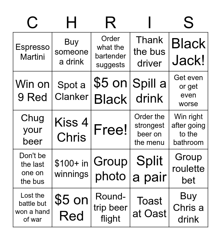 This bingo card has a free space and 24 words: $100+ in winnings, $5 on Red, $5 on Black, Lost the battle but won a hand of war, Black Jack!, Espresso Martini, Win on 9 Red, Buy someone a drink, Order the strongest beer on the menu, Group photo, Spill a drink, Chug your beer, Split a pair, Group roulette bet, Spot a Clanker, Toast at Oast, Win right after going to the bathroom, Order what the bartender suggests, Get even or get even worse, Kiss 4 Chris, Buy Chris a drink, Don't be the last one on the bus, Thank the bus driver and Round-trip beer flight.