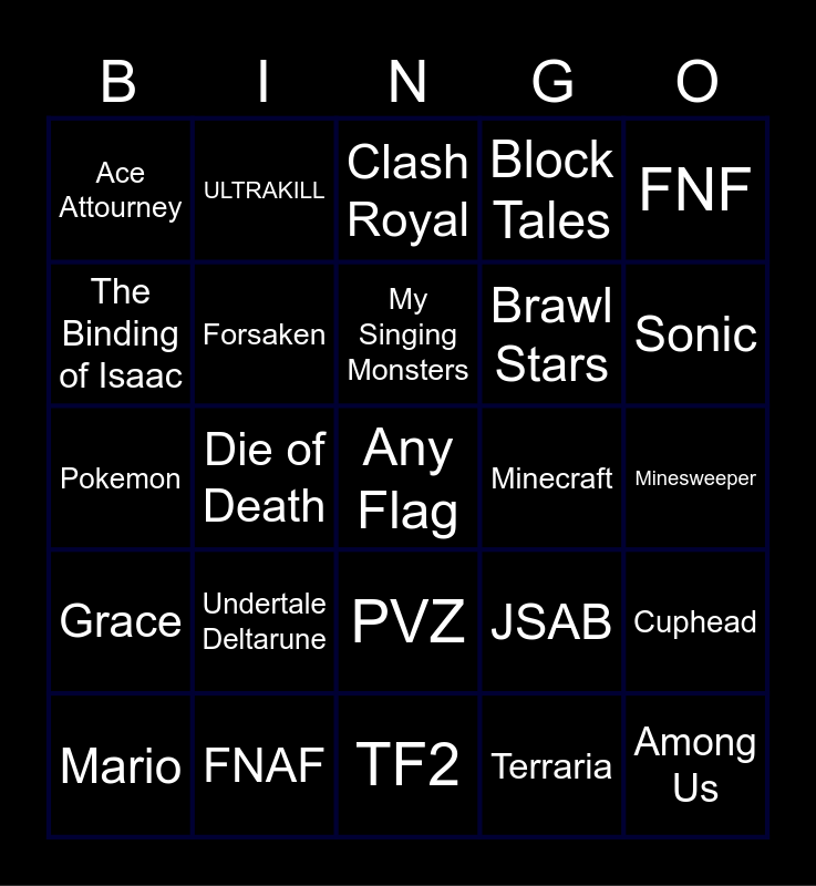 This bingo card has a free space and 24 words: Undertale Deltarune, FNAF, My Singing Monsters, Mario, FNF, Ace Attourney, The Binding of Isaac, ULTRAKILL, Minecraft, PVZ, Brawl Stars, Pokemon, JSAB, Cuphead, Forsaken, Terraria, Minesweeper, Clash Royal, Sonic, Die of Death, Among Us, Grace, Block Tales and TF2.