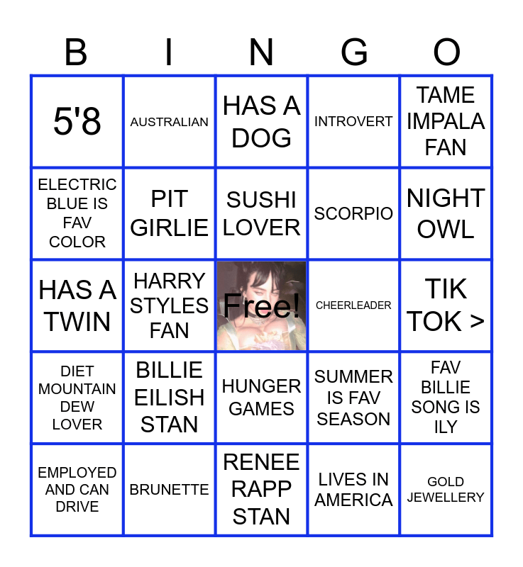 This bingo card has a free space and 24 words: BILLIE EILISH STAN, BRUNETTE, SUSHI LOVER, EMPLOYED AND CAN DRIVE, TAME IMPALA FAN, 5'8, ELECTRIC BLUE IS FAV COLOR, AUSTRALIAN, CHEERLEADER, HUNGER GAMES, SCORPIO, HAS A TWIN, SUMMER IS FAV SEASON, FAV BILLIE SONG IS ILY, PIT GIRLIE, LIVES IN AMERICA, TIK TOK >, HAS A DOG, NIGHT OWL, HARRY STYLES FAN, GOLD JEWELLERY, DIET MOUNTAIN DEW LOVER, INTROVERT and RENEE RAPP STAN.