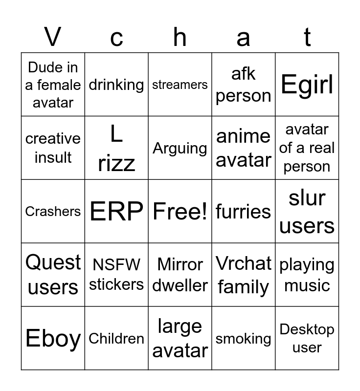 This bingo card has a free space and 24 words: NSFW stickers, Children, Arguing, Eboy, Egirl, Dude in a female avatar, creative insult, drinking, furries, Mirror dweller, anime avatar, Crashers, Vrchat family, playing music, L rizz, smoking, slur users, streamers, avatar of a real person, ERP, Desktop user, Quest users, afk person and large avatar.