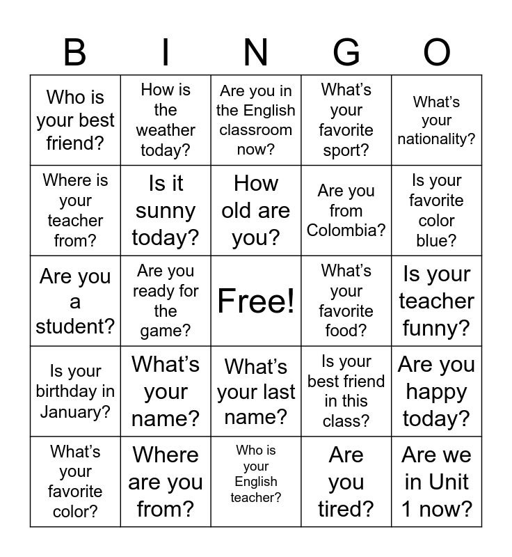 This bingo card has a free space and 24 words: What’s your name?, Where are you from?, How old are you?, What’s your favorite color?, What’s your nationality?, Who is your best friend?, Where is your teacher from?, How is the weather today?, What’s your favorite food?, What’s your last name?, Are you from Colombia?, Are you a student?, Is your best friend in this class?, Are you happy today?, Is it sunny today?, Are you tired?, Is your teacher funny?, Are you in the English classroom now?, Is your favorite color blue?, Are you ready for the game?, Are we in Unit 1 now?, Is your birthday in January?, What’s your favorite sport? and Who is your English teacher?.