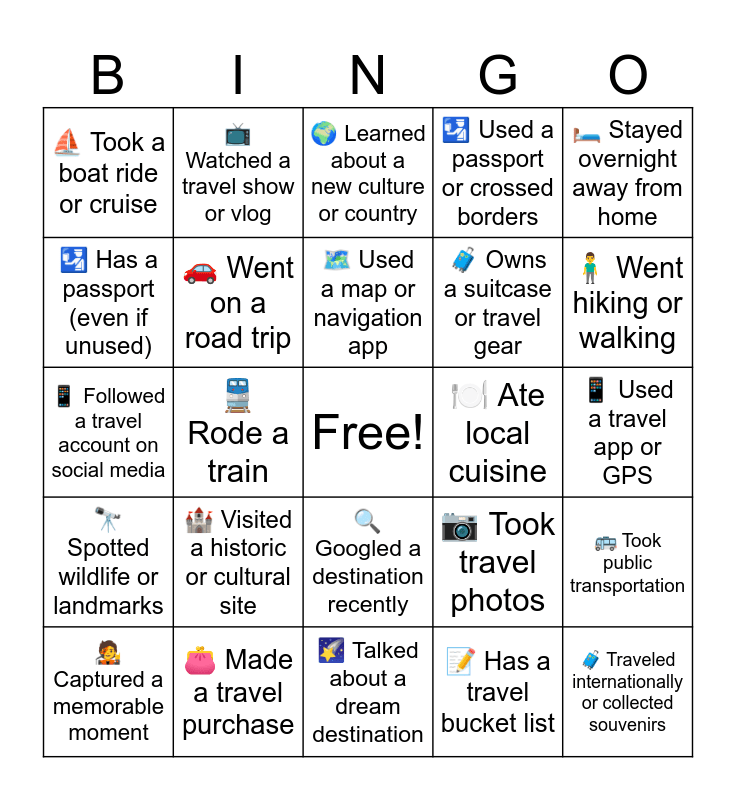 This bingo card has a free space and 36 words: βοΈ Took a flight, ποΈ Visited a scenic nature spot, π§³ Packed for a trip, π Went on a road trip, π· Took travel photos, π Spotted wildlife or landmarks, πΊοΈ Used a map or navigation app, π΄ Relaxed somewhere tropical, ποΈ Stayed overnight away from home, πͺ§ Followed travel signs or explored a city, π Rode a train, π Used a passport or crossed borders, π§ Tried something new or adventurous, π½οΈ Ate local cuisine, π§ββοΈ Went hiking or walking, β΅ Took a boat ride or cruise, π Rode in a taxi or rideshare, π° Visited a historic or cultural site, π§³ Traveled internationally or collected souvenirs, π Learned about a new culture or country, π± Used a travel app or GPS, π Took public transportation, π Made a travel purchase, π§βπ€ Captured a memorable moment, π Talked about a dream destination, πΊ Watched a travel show or vlog, π± Followed a travel account on social media, π€ Helped someone plan a trip, π§³ Owns a suitcase or travel gear, π Has a passport (even if unused), π’ Wants to go on a cruise someday, π£οΈ Knows someone who just got back from a trip, π Has a travel bucket list, π Googled a destination recently, π Attended a travel-themed party and π» Took a virtual tour or online experience.