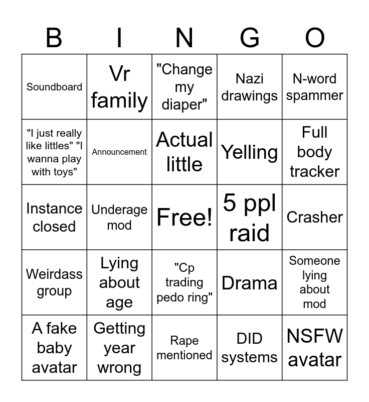 This bingo card has a free space and 24 words: Lying about age, Getting year wrong, Actual little, A fake baby avatar, N-word spammer, Soundboard, "I just really like littles" "I wanna play with toys", Vr family, 5 ppl raid, "Cp trading pedo ring", Yelling, Instance closed, Drama, Someone lying about mod, Announcement, DID systems, Crasher, "Change my diaper", Full body tracker, Underage mod, NSFW avatar, Weirdass group, Nazi drawings and Rape mentioned.