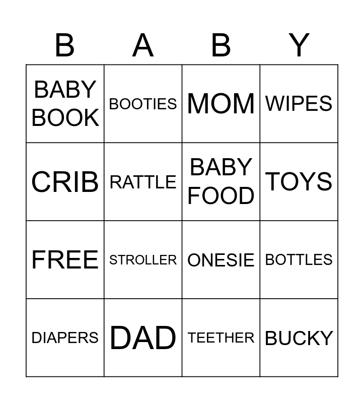 This bingo card has 20 words: BOTTLES, PACIFIER, MOM, HIGHCHAIR, DIAPERS, CRIB, DAD, BABY BOOK, FREE, BOOTIES, STROLLER, ONESIE, RATTLE, BUCKY, BABY FOOD, BIBS, TOYS, WIPES, TEETHER and BOUNCER.