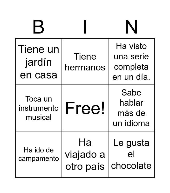 This bingo card has a free space and 8 words: Sabe hablar más de un idioma, Ha visto una serie completa en un día., Tiene hermanos, Ha ido de campamento, Tiene un jardín en casa, Le gusta el chocolate, Toca un instrumento musical and Ha viajado a otro país.