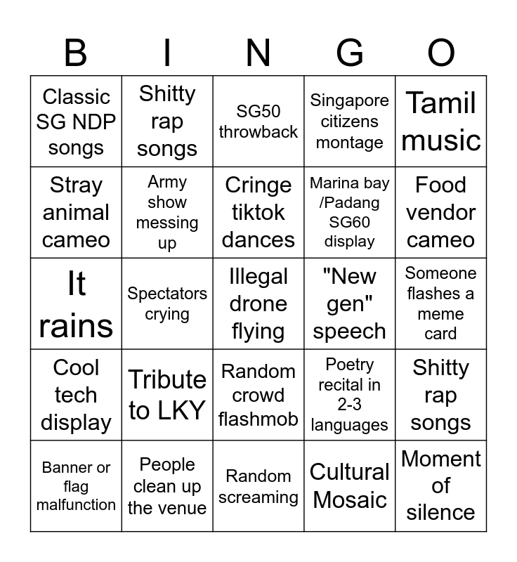 This bingo card has 25 words: Tribute to LKY, Random screaming, Cringe tiktok dances, Banner or flag malfunction, Tamil music, Classic SG NDP songs, Stray animal cameo, Shitty rap songs, "New gen" speech, Random crowd flashmob, Marina bay /Padang SG60 display, It rains, Poetry recital in 2-3 languages, Shitty rap songs, Army show messing up, Moment of silence, Someone flashes a meme card, SG50 throwback, Food vendor cameo, Spectators crying, Illegal drone flying, People clean up the venue, Cool tech display, Singapore citizens montage and Cultural Mosaic.