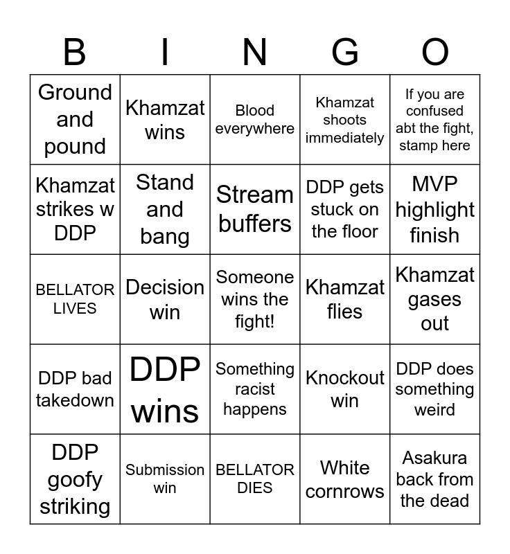 This bingo card has a free space and 24 words: DDP wins, Submission win, Stream buffers, DDP goofy striking, If you are confused abt the fight, stamp here, Ground and pound, Khamzat strikes w DDP, Khamzat wins, Khamzat flies, Something racist happens, DDP gets stuck on the floor, BELLATOR LIVES, Knockout win, DDP does something weird, Stand and bang, White cornrows, Khamzat gases out, Blood everywhere, MVP highlight finish, Decision win, Asakura back from the dead, DDP bad takedown, Khamzat shoots immediately and BELLATOR DIES.