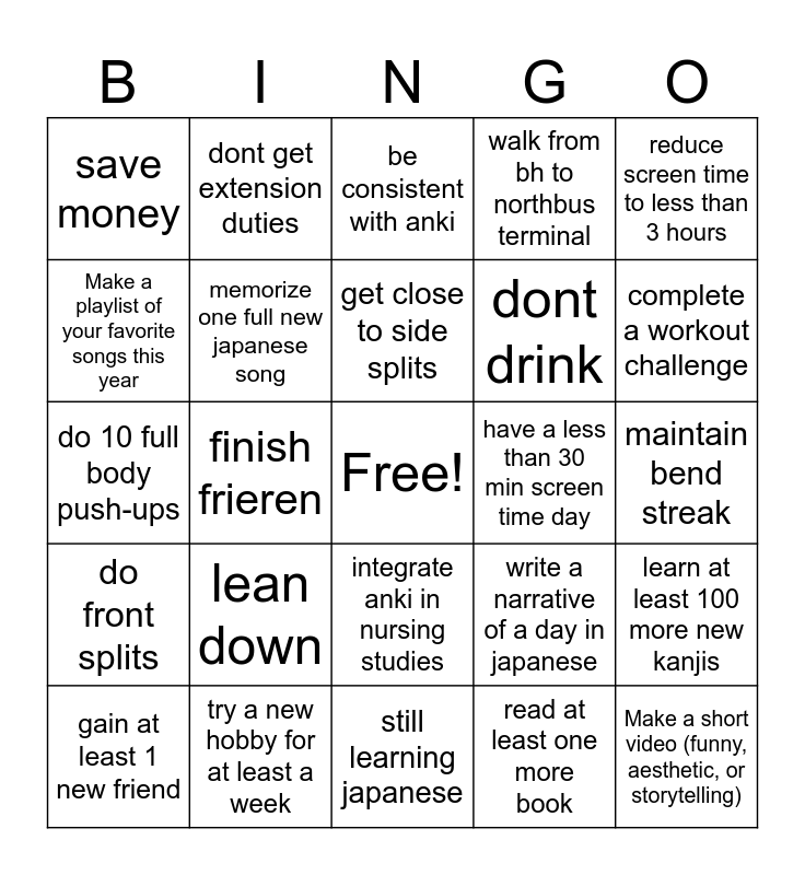 This bingo card has a free space and 24 words: lean down, try a new hobby for at least a week, get close to side splits, gain at least 1 new friend, reduce screen time to less than 3 hours, save money, Make a playlist of your favorite songs this year, dont get extension duties, have a less than 30 min screen time day, integrate anki in nursing studies, dont drink, do 10 full body push-ups, write a narrative of a day in japanese, learn at least 100 more new kanjis, memorize one full new japanese song, read at least one more book, maintain bend streak, be consistent with anki, complete a workout challenge, finish frieren, Make a short video (funny, aesthetic, or storytelling), do front splits, walk from bh to northbus terminal and still learning japanese.