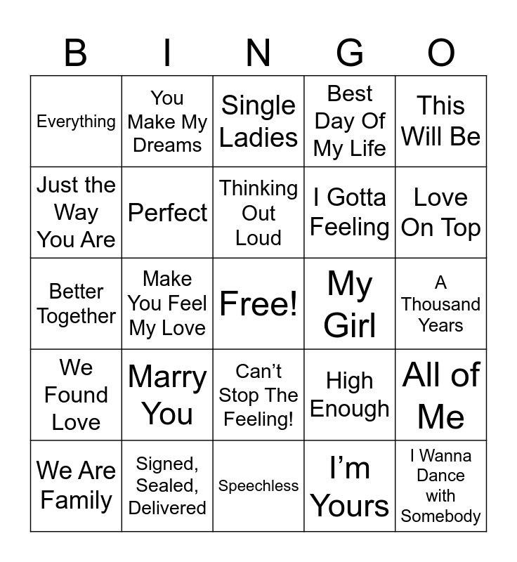 This bingo card has a free space and 30 words: Signed, Sealed, Delivered, Marry Me, Make You Feel My Love, September, Everything, Single Ladies, Perfect, Can’t Stop The Feeling!, My Girl, Speechless, A Thousand Years, I Wanna Dance with Somebody, I’m Yours, You Are The Best Thing, Love On Top, Ain’t No Mountain, High Enough, We Found Love, Marry You, This Will Be, Better Together, Crazy In Love, You Make My Dreams, I Gotta Feeling, Just the Way You Are, Best Day Of My Life, All of Me, We Are Family, Thinking Out Loud and Shut Up and Dance.