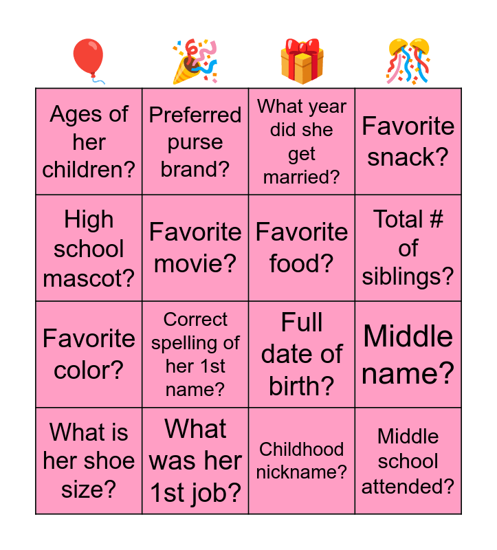This bingo card has 16 words: What is her shoe size?, What was her 1st job?, What year did she get married?, Favorite snack?, High school mascot?, Preferred purse brand?, Full date of birth?, Middle name?, Ages of her children?, Favorite movie?, Childhood nickname?, Total # of siblings?, Favorite color?, Correct spelling of her 1st name?, Favorite food? and Middle school attended?.