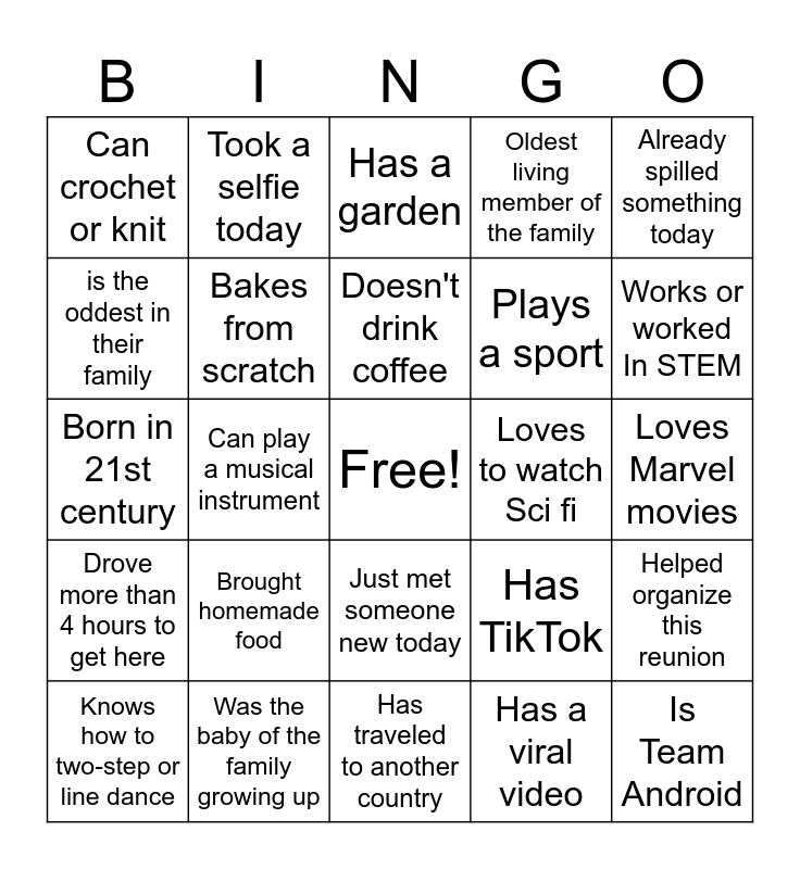 This bingo card has a free space and 31 words: Has traveled to another country, Is retired, Can play a musical instrument, Is a professional dancer, Can crochet or knit, Has a garden, Bakes from scratch, Has TikTok, Loves to watch Sci fi, Has a viral video, Loves Marvel movies, Is Team Android, Was named after someone in the family, Shares a birthday month with you, Works or worked In STEM, Was born in the same decade as you, Helped organize this reunion, Brought homemade food, Drove more than 4 hours to get here, Just met someone new today, Already spilled something today, Can fall asleep anywhere, Knows how to two-step or line dance, Took a selfie today, Plays a sport, is the oddest in their family, Oldest living member of the family, Born in 21st century, Was the baby of the family growing up, Doesn't drink coffee and Has more than one pet.