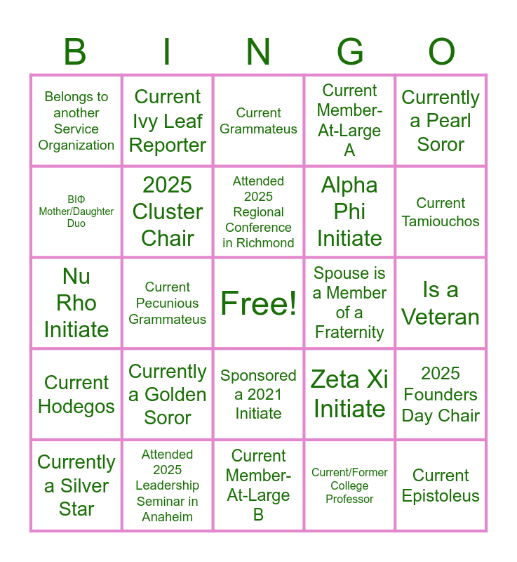 This bingo card has a free space and 24 words: Currently a Golden Soror, Attended 2025 Leadership Seminar in Anaheim, Attended 2025 Regional Conference in Richmond, Currently a Silver Star, Currently a Pearl Soror, Belongs to another Service Organization, BIΦ Mother/Daughter Duo, Current Ivy Leaf Reporter, Spouse is a Member of a Fraternity, Sponsored a 2021 Initiate, Alpha Phi Initiate, Nu Rho Initiate, Zeta Xi Initiate, 2025 Founders Day Chair, 2025 Cluster Chair, Current/Former College Professor, Is a Veteran, Current Grammateus, Current Tamiouchos, Current Pecunious Grammateus, Current Epistoleus, Current Hodegos, Current Member-At-Large A and Current Member-At-Large B.