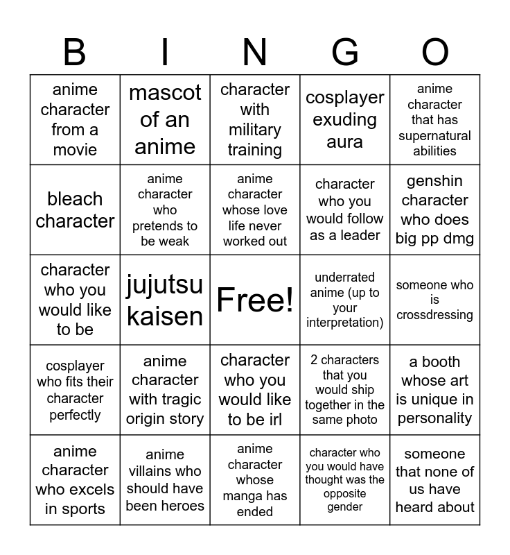 This bingo card has a free space and 24 words: anime character with tragic origin story, anime villains who should have been heroes, anime character whose love life never worked out, anime character who excels in sports, anime character that has supernatural abilities, anime character from a movie, bleach character, mascot of an anime, underrated anime (up to your interpretation), character who you would like to be irl, character who you would follow as a leader, character who you would like to be, 2 characters that you would ship together in the same photo, a booth whose art is unique in personality, anime character who pretends to be weak, character who you would have thought was the opposite gender, someone who is crossdressing, character with military training, genshin character who does big pp dmg, jujutsu kaisen, someone that none of us have heard about, cosplayer who fits their character perfectly, cosplayer exuding aura and anime character whose manga has ended.
