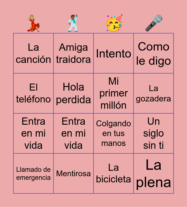 This bingo card has 156 words: Titi me pregunt贸, Despecha, Despacito, Llamado de emergencia, Ella y yo, La Macarena, La bilirrubina, Fiera inquieta, La due帽a del swing, Suavemente, Mi primer mill贸n, La camisa negra, Colgando en tus manos, Sobredosis de chamame, Hola perdida, La gozadera, El problema, Te vas, Parte y choke, Soltera, La plena, You鈥檙e the one that I want, Everybody, Staying alive, Pegao, Ciudad m谩gica, Un siglo sin ti, Torero, La caba帽a, Mentirosa, Que me falte todo, Soy sabalero, Autom谩tico, Obsesi贸n, Deja de llorar, Rock del gato, Mil horas, Flores amarillas, Magalenha, El tel茅fono, Capaz, Si antes te hubiera conocido, Que tengo que hacer, No me arrepiento de este amor, I gotta feeling, APT, Alegr铆a, 脥ndigo, Locuras contigo, La ley y la trampa, Bailemos kuduro, Fuego, Ocho cuarenta, Amiga traidora, Tramposa y mentirosa, Como le digo, La guitarra de Lolo, Quien es ese hombre, A esa, YMCA, Nunca me faltes, La bicicleta, Coraz贸n partido, Entra en mi vida, La morocha, Ahora te podes marchar, Intento, Tus ojos marrones, Loco un poco, La canci贸n, Metele sazon, Coraz贸n vac铆o, Loco, Tatto, La bachata, Azul, Titi me pregunt贸, Titi me pregunt贸, Titi me pregunt贸, Azul, La bachata, Tatto, Loco, Coraz贸n vac铆o, Metele sazon, La canci贸n, Loco un poco, Tus ojos marrones, Intento, Ahora te podes marchar, La morocha, Entra en mi vida, Coraz贸n partido, La bicicleta, Nunca me faltes, YMCA, A esa, La guitarra de Lolo, Como le digo, Tramposa y mentirosa, Amiga traidora, La bilirrubina, La Macarena, Despacito, Despecha, Titi me pregunt贸, Quien es ese hombre, Ocho cuarenta, Fuego, La ley y la trampa, Bailemos kuduro, Locuras contigo, 脥ndigo, Alegr铆a, APT, I gotta feeling, No me arrepiento de este amor, Que tengo que hacer, Si antes te hubiera conocido, Capaz, El tel茅fono, Magalenha, Flores amarillas, Mil horas, Rock del gato, Deja de llorar, Ella y yo, Obsesi贸n, Autom谩tico, Soy sabalero, Que me falte todo, Mentirosa, La caba帽a, Torero, Un siglo sin ti, Ciudad m谩gica, Pegao, Staying alive, Everybody, You鈥檙e the one that I want, La plena, Soltera, Parte y choke, Te vas, El problema, La gozadera, Es por ti, Hola perdida, Colgando en tus manos, Suavemente, Mi primer mill贸n, La due帽a del swing, La camisa negra, Sobredosis de chamame, Llamado de emergencia and Fiera inquieta.