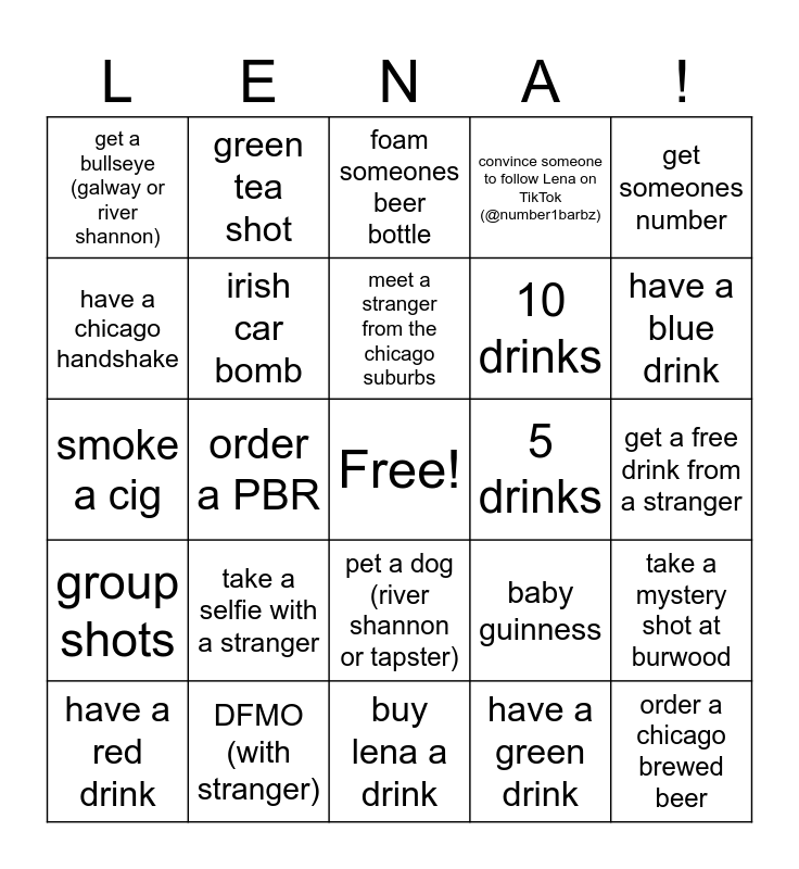 This bingo card has a free space and 24 words: take a selfie with a stranger, DFMO (with stranger), meet a stranger from the chicago suburbs, have a red drink, get someones number, get a bullseye (galway or river shannon), have a chicago handshake, green tea shot, 5 drinks, pet a dog (river shannon or tapster), 10 drinks, smoke a cig, baby guinness, take a mystery shot at burwood, irish car bomb, have a green drink, get a free drink from a stranger, foam someones beer bottle, have a blue drink, order a PBR, order a chicago brewed beer, group shots, convince someone to follow Lena on TikTok (@number1barbz) and buy lena a drink.