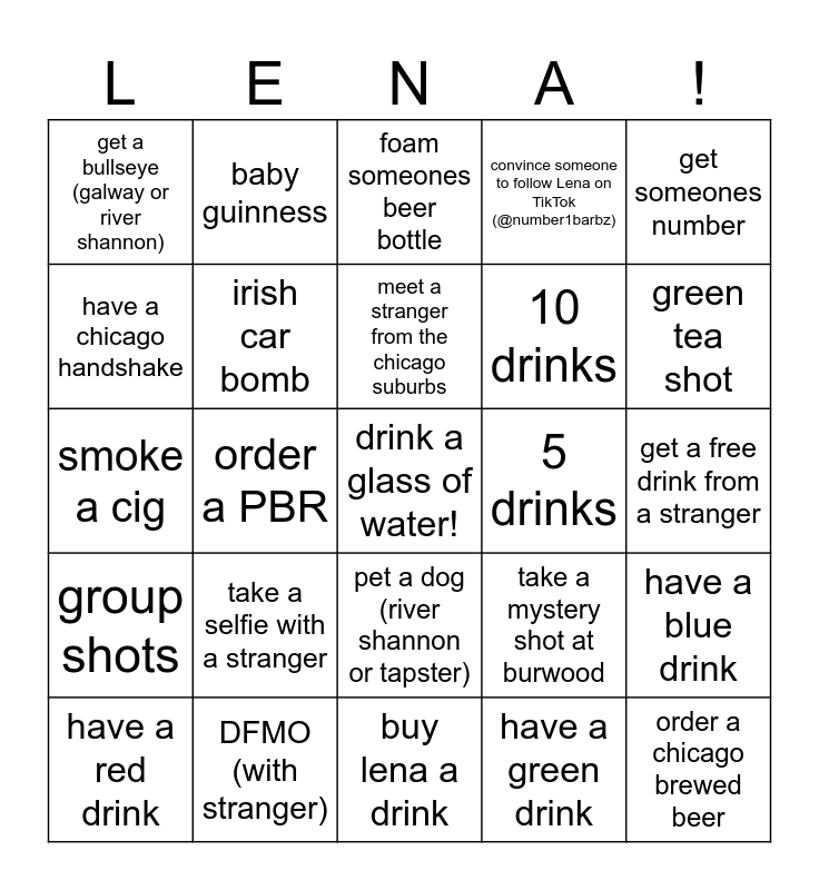 This bingo card has a free space and 24 words: take a selfie with a stranger, DFMO (with stranger), meet a stranger from the chicago suburbs, have a red drink, get someones number, get a bullseye (galway or river shannon), have a chicago handshake, baby guinness, 5 drinks, pet a dog (river shannon or tapster), 10 drinks, smoke a cig, take a mystery shot at burwood, have a blue drink, irish car bomb, have a green drink, get a free drink from a stranger, foam someones beer bottle, green tea shot, order a PBR, order a chicago brewed beer, group shots, convince someone to follow Lena on TikTok (@number1barbz) and buy lena a drink.