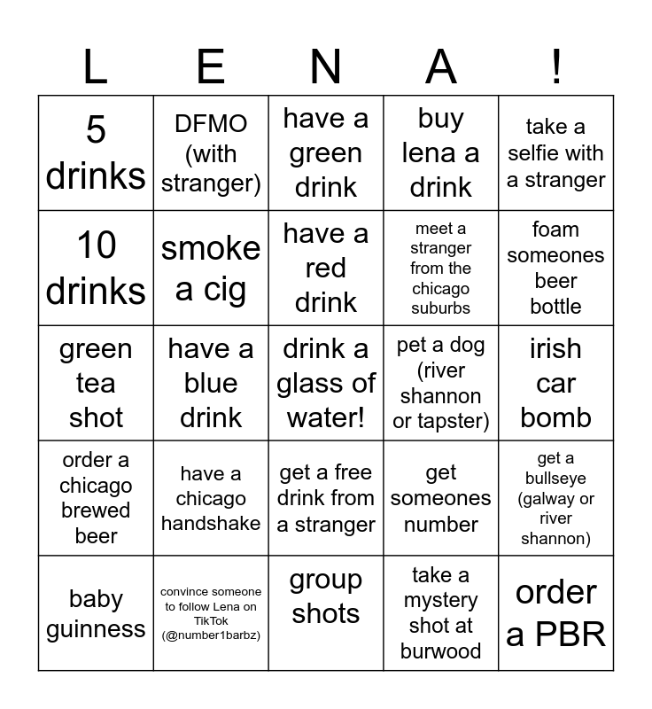 This bingo card has a free space and 24 words: have a chicago handshake, convince someone to follow Lena on TikTok (@number1barbz), have a red drink, baby guinness, take a selfie with a stranger, 5 drinks, 10 drinks, DFMO (with stranger), pet a dog (river shannon or tapster), get a free drink from a stranger, meet a stranger from the chicago suburbs, green tea shot, get someones number, get a bullseye (galway or river shannon), smoke a cig, take a mystery shot at burwood, irish car bomb, have a green drink, foam someones beer bottle, have a blue drink, order a PBR, order a chicago brewed beer, buy lena a drink and group shots.