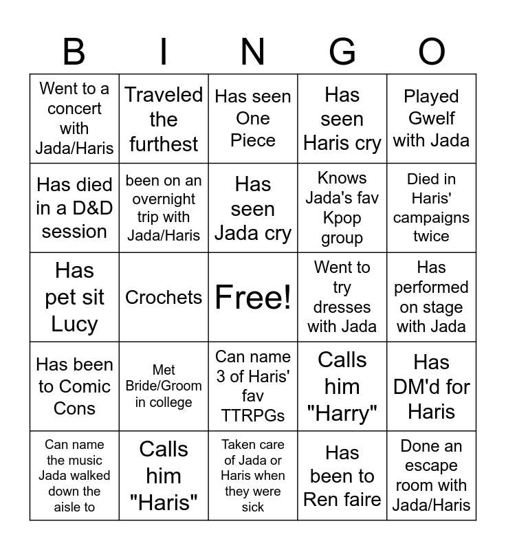 This bingo card has a free space and 24 words: Met Bride/Groom in college, Calls him "Haris", Has seen Jada cry, Can name the music Jada walked down the aisle to, Played Gwelf with Jada, Went to a concert with Jada/Haris, Has died in a D&D session, Traveled the furthest, Went to try dresses with Jada, Can name 3 of Haris' fav TTRPGs, Knows Jada's fav Kpop group, Has pet sit Lucy, Calls him "Harry", Has DM'd for Haris, been on an overnight trip with Jada/Haris, Has been to Ren faire, Has performed on stage with Jada, Has seen One Piece, Died in Haris' campaigns twice, Crochets, Done an escape room with Jada/Haris, Has been to Comic Cons, Has seen Haris cry and Taken care of Jada or Haris when they were sick.