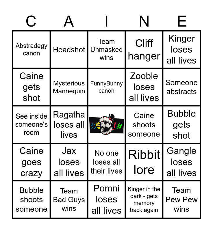 This bingo card has a free space and 24 words: Jax loses all lives, Team Bad Guys wins, FunnyBunny canon, Bubble shoots someone, Kinger loses all lives, Abstradegy canon, Caine gets shot, Headshot, Caine shoots someone, No one loses all their lives, Zooble loses all lives, See inside someone's room, Ribbit lore, Gangle loses all lives, Mysterious Mannequin, Kinger in the dark - gets memory back again, Bubble gets shot, Team Unmasked wins, Someone abstracts, Ragatha loses all lives, Team Pew Pew wins, Caine goes crazy, Cliff hanger and Pomni loses all lives.