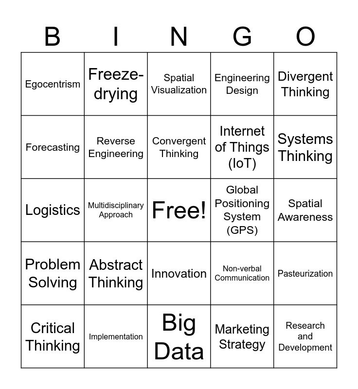 This bingo card has a free space and 25 words: Abstract Thinking, Big Data, Convergent Thinking, Critical Thinking, Divergent Thinking, Egocentrism, Forecasting, Freeze-drying, Global Positioning System (GPS), Innovation, Internet of Things (IoT), Logistics, Non-verbal Communication, Pasteurization, Reverse Engineering, Sociocentrism, Spatial Awareness, Spatial Visualization, Systems Thinking, Multidisciplinary Approach, Research and Development, Implementation, Problem Solving, Engineering Design and Marketing Strategy.