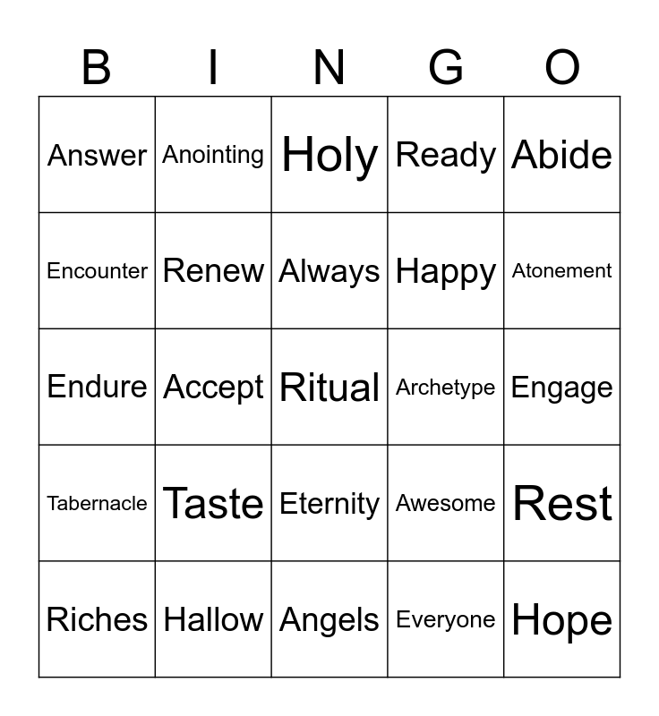 This bingo card has 40 words: Free!, Endure, Enter, Eternity, Everyone, Engage, Encounter, Eden, Always, Awesome, Abide, Answer, Accept, Angels, Archetype, Atonement, After, Anointing, Apocalyptic, Ready, Rest, Riches, Renew, Ritual, Restoration, Resurrection, Royal, Thankful, Trust, Truth, Temple, Tabernacle, Taste, Heaven, Happy, Hope, Hereafter, Hallow, Holy and Humanity.