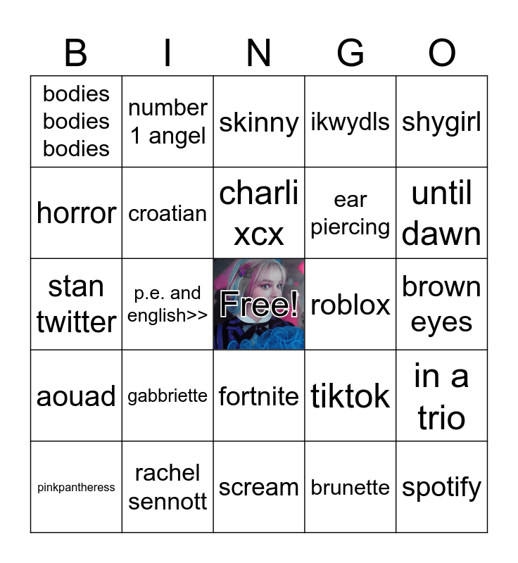 This bingo card has a free space and 24 words: gabbriette, rachel sennott, charli xcx, pinkpantheress, shygirl, bodies bodies bodies, horror, number 1 angel, roblox, fortnite, ear piercing, stan twitter, tiktok, in a trio, croatian, brunette, brown eyes, skinny, until dawn, p.e. and english>>, spotify, aouad, ikwydls and scream.
