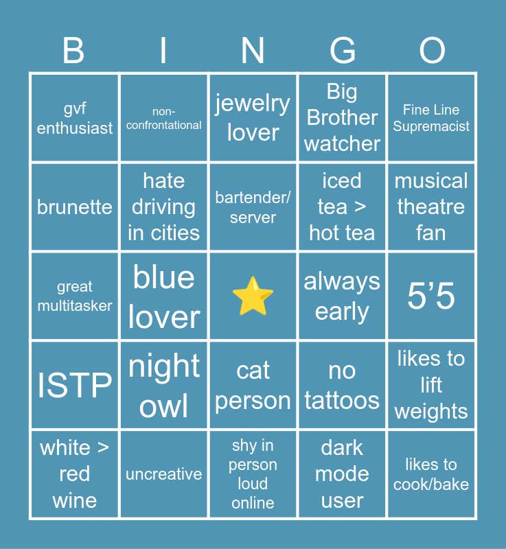 This bingo card has a free space and 24 words: night owl, uncreative, bartender/ server, white > red wine, Fine Line Supremacist, gvf enthusiast, brunette, non- confrontational, always early, cat person, iced tea > hot tea, great multitasker, no tattoos, likes to lift weights, hate driving in cities, dark mode user, 5’5, jewelry lover, musical theatre fan, blue lover, likes to cook/bake, ISTP, Big Brother watcher and shy in person loud online.