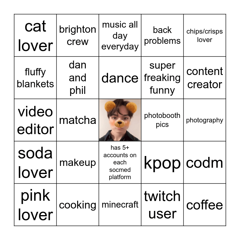 This bingo card has a free space and 24 words: pink lover, makeup, dance, twitch user, chips/crisps lover, cat lover, brighton crew, music all day everyday, photobooth pics, photography, video editor, dan and phil, kpop, codm, fluffy blankets, cooking, minecraft, back problems, content creator, soda lover, matcha, has 5+ accounts on each socmed platform, super freaking funny and coffee.