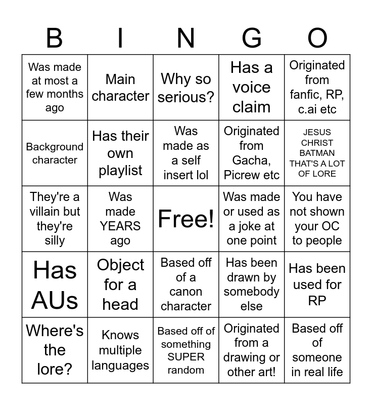 This bingo card has a free space and 49 words: Furry or animalistic traits, Based off of someone in real life, Human or humanoid, Based off of something SUPER random, Object for a head, Was made for a specific fandom, Main character, No fandom, Background character, Multiple fandoms, Has their own playlist, Has a voice claim, Has been used for RP, Has been drawn by somebody else, Was made or used to vent, Was made to be shipped with another character, Was made as a self insert lol, Was made or used as a joke at one point, Was made only or partially for plot reasons, Originated from fanfic, RP, c.ai etc, Was made YEARS ago, Originated from a drawing or other art!, Was made at most a few months ago, Originated from Gacha, Picrew etc, Alternative aesthetic, JESUS CHRIST BATMAN THAT'S A LOT OF LORE, Where's the lore?, LGBTQ or supports!, Based off of a canon character, Has AUs, You have made them on Picrew or Gacha, Dating or married to a canon character, Sibling/family member/relative of a canon character, You have drawn them in FlipaClip, Knows multiple languages, POC, Persona/Mascot, You have shown lots of people your OC, You have not shown your OC to people, Pure character, Semi-pure character, Neutral character, OC is a POS, OC is literally evil, They're a villain but they're silly, Why so serious?, You have cosplayed your OC, Bro thinks he's part of the team and OC blends in so well they look canon.
