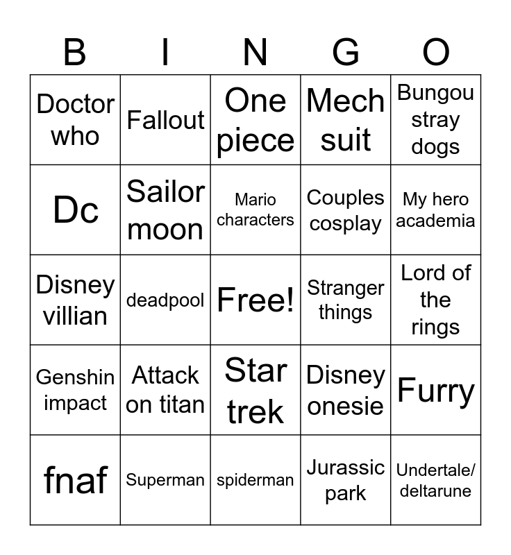 This bingo card has a free space and 29 words: fnaf, Pokemon, deadpool, Miku, Doctor who, One piece, Sailor moon, Attack on titan, Stranger things, Superman, Lord of the rings, Undertale/ deltarune, spiderman, Jurassic park, My hero academia, Avengers, Star trek, Genshin impact, Bungou stray dogs, Disney villian, Disney onesie, Star wars, Couples cosplay, Dc, Mech suit, Fallout, Furry, Mario characters and Cringe Harry Potter.
