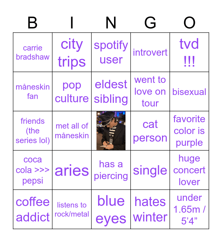 This bingo card has a free space and 24 words: aries, listens to rock/metal, eldest sibling, coffee addict, tvd !!!, carrie bradshaw, måneskin fan, city trips, cat person, has a piercing, went to love on tour, friends (the series lol), single, huge concert lover, pop culture, hates winter, favorite color is purple, spotify user, bisexual, met all of måneskin, under 1.65m / 5’4”, coca cola >>> pepsi, introvert and blue eyes.