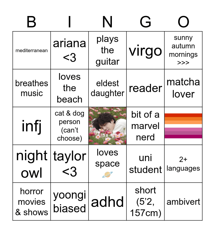 This bingo card has 1 images, a free space and 23 words: taylor <3, yoongi biased, eldest daughter, horror movies & shows, sunny autumn mornings >>>, mediterranean, breathes music, ariana <3, bit of a marvel nerd, loves space 🪐, reader, infj, uni student, 2+ languages, loves the beach, short (5’2, 157cm), plays the guitar, matcha lover, cat & dog person (can’t choose), ambivert, night owl, virgo and adhd.