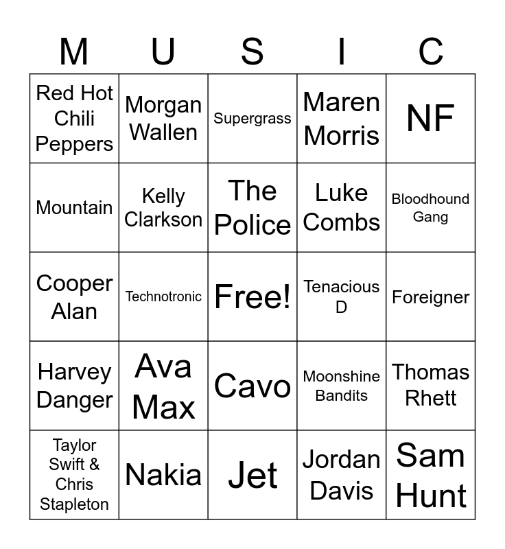 This bingo card has a free space and 59 words: Jamiroquai, Nakia, Ed Sheeran, Harvey Danger, Jordan Davis, Kane Brown, Kelly Clarkson, Shawn Mendes, Luke Combs, Megan Moroney, Maren Morris, Miranda Lambert, Mountain, Nirvana, Ozzy Osbourne, Red Hot Chili Peppers, Sam Hunt, NF, Shaboozey, The Police, Tenacious D, Supergrass, Taylor Swift & Chris Stapleton, Thomas Rhett, Weezer, Staind, Chris Young, Brooks & Dunn, Bloodhound Gang, Blake Shelton, Billy Currington, Bailey Zimmerman, Anne Wilson, Jelly Roll, Morgan Wallen, The Human League, Black Eyed Peas, Technotronic, Zac Brown Band, Cooper Alan, Ghost Hounds, Ava Max, Foreigner, Silent Theory, Rush, Black Stone Cherry, Atlus, 2 Pac & Dr Dre, Cavo, Jet, David Gilmour, Lisa Lisa & Cult Jam, In This Moment, Carl Douglas, ZZ Top, Moonshine Bandits, Terminal Choice, Daughtry and B.T.O..