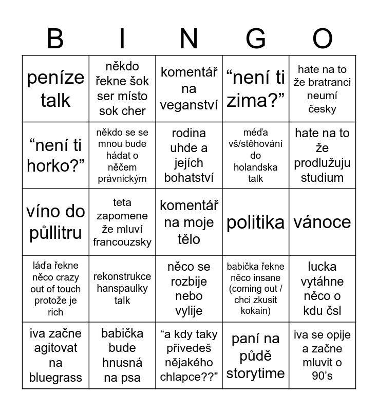 This bingo card has a free space and 24 words: rekonstrukce hanspaulky talk, babička bude hnusná na psa, rodina uhde a jejích bohatství, iva začne agitovat na bluegrass, hate na to že bratranci neumí česky, peníze talk, “není ti horko?”, někdo řekne šok ser místo sok cher, politika, něco se rozbije nebo vylije, méďa vš/stěhování do holandska talk, víno do půllitru, babička řekne něco insane (coming out / chci zkusit kokain), lucka vytáhne něco o kdu čsl, někdo se se mnou bude hádat o něčem právnickým, paní na půdě storytime, vánoce, komentář na veganství, hate na to že prodlužuju studium, teta zapomene že mluví francouzsky, iva se opije a začne mluvit o 90’s, láďa řekne něco crazy out of touch protože je rich, “není ti zima?” and “a kdy taky přivedeš nějakého chlapce??”.