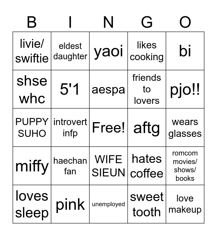 This bingo card has a free space and 24 words: haechan fan, pink, aespa, loves sleep, bi, livie/ swiftie, shse whc, eldest daughter, aftg, WIFE SIEUN, friends to lovers, PUPPY SUHO, hates coffee, romcom movies/ shows/ books, 5'1, sweet tooth, wears glasses, yaoi, pjo!!, introvert infp, love makeup, miffy, likes cooking and unemployed.